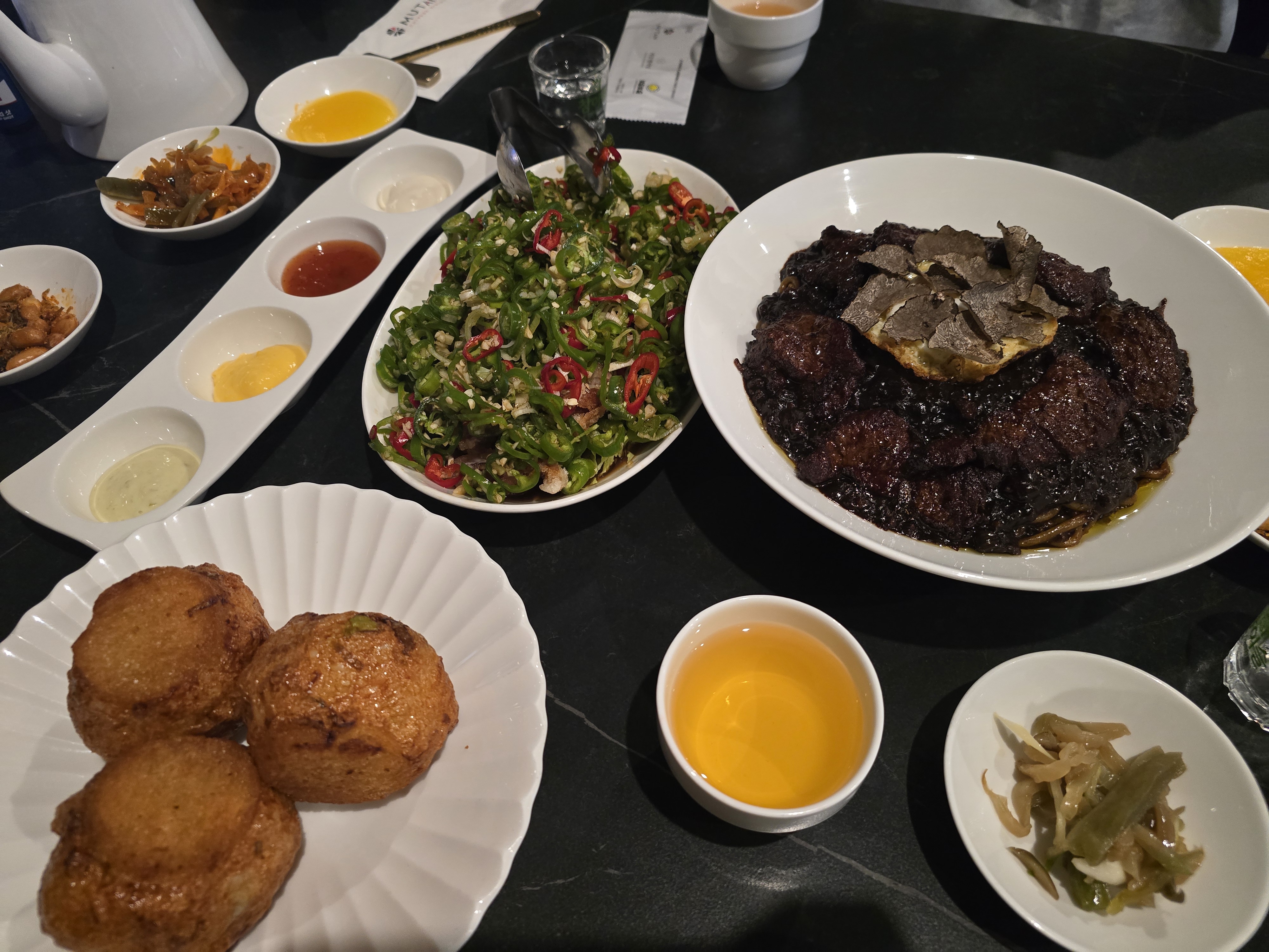저희는 무탄에서 꼭 먹어봐야 할 시그니처 메뉴들을 중심으로 주문했어요. 가장 기대했던 투뿔스테이크 트러플6배 자장면부터 사이드로 유명한 마카롱 멘보샤와 고추 유린기까지요. 메뉴 하나하나가 평범함을 거부하는 개성이 강했어요. 친구들도 '이건 진짜 사진 찍어야 해!'라며 난리도 아니었죠. 😊